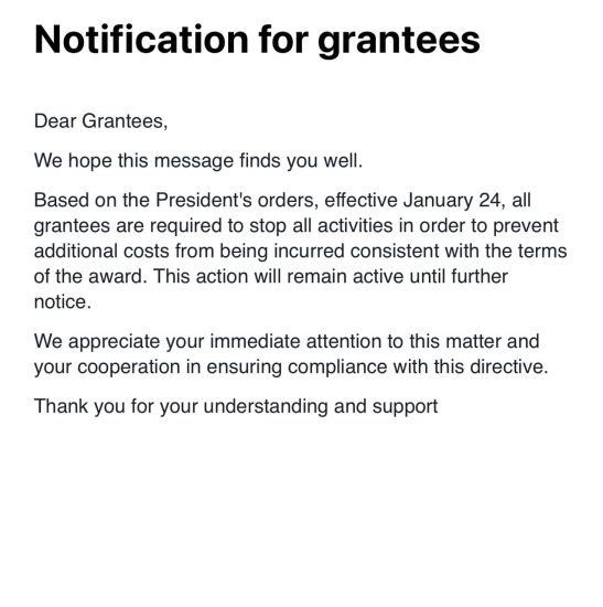 “Partnerët e programeve dhe zbatuesit e programeve të ndihmës së financuar nga SHBA në Shqipëri po njoftohen për këtë veprim. Ambasada e Shteteve të Bashkuara të Amerikës kërkon me mirësjellje që ky njoftim të ndahet me të gjitha ministritë, institucionet dhe entet e tjera qeveritare përkatëse që bashkëpunojnë përmes programeve ekzistuese të ndihmës së huaj të SHBA-së.