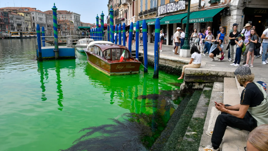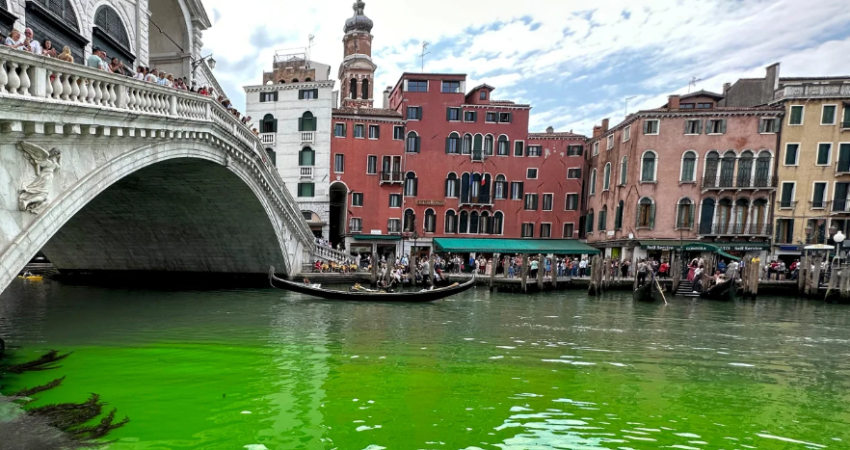 Uji në kanalet e famshme të Venecias të dielën mori ngjyrë jeshile fluoreshente, duke tërhequr edhe vëmendjen e autoriteteve vendas, jo vetëm të banorëve dhe turistëve.