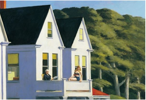 Shtëpia është tipike për Hopper, çati e bardhë dhe e heshtur përballë qiellit ngjyrë kobalt. Dielli godet zonjën e moshuar të veshur me të zeza dhe vajzën e re që pret dikë apo diçka. Por midis tyre ekziston një zbrazëtirë. Cila është marrëdhënia e tyre? Pse shtëpia po shikon diellin sikur të shikonte diçka gjithashtu? Kati i dytë në diell është ana e errët dhe shqetësuese e verës, është fragmenti nostalgjik i dy jetëve të vetmuara që për ndonjë arsye janë në të njëjtin vend dhe në të njëjtin moment.