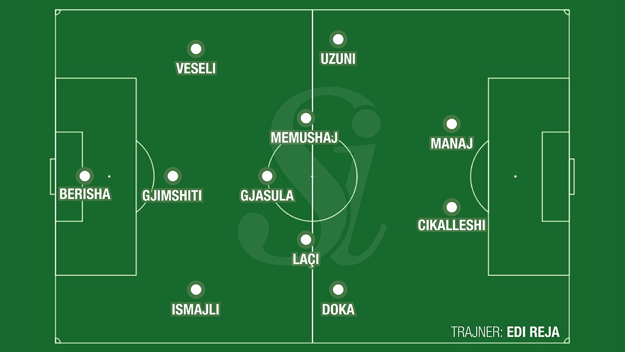 Në “Air Albania Stadium”, në orën 16:00, Shqipëria do të zbresë në fushë me një formacion sulmues, kjo është e sigurt. Pak më sulmues ndoshta se ndaj Kazakistanit, pasi Doka, i cili mendohet të zëvendësojë Hysajn e prekur nga Covid-19, është një lojtar krahu më sulmues se shkodrani. Në fushë nga minuta e parë pritet të jenë sulmuesit Cikalleshi, Manaj dhe Uzuni, ky i fundit në të majtë të mesfushës me 5 lojtarë. Vendin e Abrashit të skualifikuar, siç pohoi edhe trajneri Reja në konferencë, mund ta zërë Laçi, por edhe Ramadani është një alternativë.
