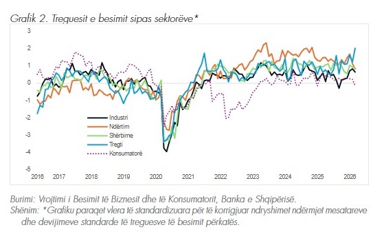 Në shërbime, besimi ra lehtë me 0.5 p.p, i ndikuar nga një rënie e vogël e kërkesës dhe e aktivitetit. Pritjet për çmimet në të ardhmen u rritën ndjeshëm.