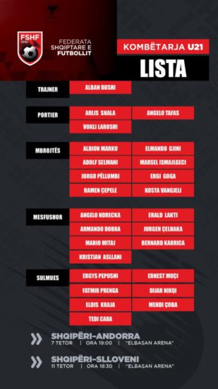 Trajneri i Kombëtares U-21, Alban Bushi, ka shpallur sot listën e të grumbulluarve për dy ndeshjet e radhës kualifikuese të Europianit, ato me Andorrën dhe Slloveninë, që zhvillohen përkatësisht më 7 dhe 11 tetor, të dyja në vendin tonë.