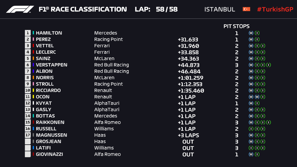 Më pas erdhi kthesa, ku anglezi arriti të afrohej, të sulmonte dhe të kalonte Perezin. Në pjesën e dytë të garës, sapo mori kryesimin, Hemilton vendosi të vazhdonte më po ato goma deri në fund dhe ato 50 xhiro treguan gjithë madhështinë e tij. Edhe Fetel e mbylli në pod, por rrezikoi ta humbiste pas ndërrimit të dytë të gomave, që kur ai dhe Stroll, dominues për 36 xhiro, nuk e gjetën më ritmin. Garë e mirë edhe për McLaren e Sainz, që zuri vendin e pestë.