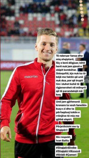 “Të nderuar fansa dhe miq shqiptarë, siç e keni dëgjuar, këtë herë nuk jam pjesë e ekipit kombëtar. Sidoqoftë, kjo nuk ka të bëjë me faktin se unë nuk dua, por trupit tim i duhet kohë që të rigjenerohet në mënyrë që të parandalojë më keq. Jam gjithmonë krenar të vesh fanellën kuqezi dhe ta përfaqësoj tokën e rrënjët e mia me gjithë shpirt. Përjetësisht me ty Shqipëri! Me respekt Ivan Balliu!”, – ka shkruar Balliu në profilin e tij në Tuiter.