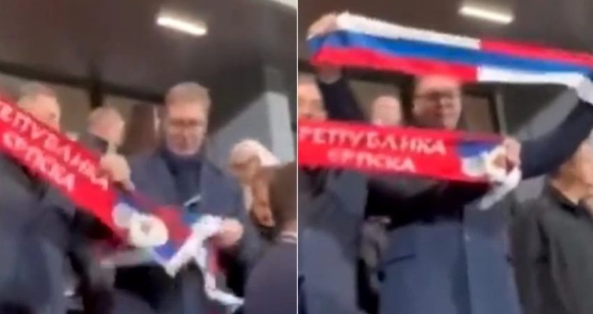 Lideri serb u shfaq në shkallët e stadiumit në shoqërinë e Milorad Dodik teksa nxirrte nga xhepi një shall me flamurin serb dhe rus, për të treguar edhe njëherë se nga është drejtuar politika e tij.