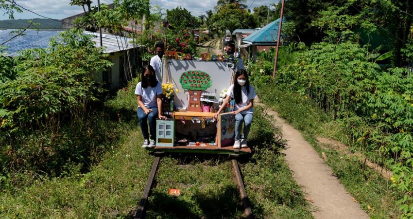 Një karrocë druri e dekoruar me shkëlqim ecën në shina hekurudhore pak të përdorura në Filipine, duke mbajtur katër mësues të rinj, dy në pjesën e përparme dhe dy prapa që e shtyjnë atë me këmbët e tyre.