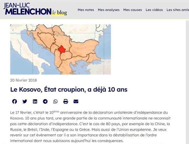 “Natyrisht, sovraniteti i Kosovës në thelb është imagjinar. 19 vjet pas viti 1999, trupat e NATO-s janë ende masivisht të pranishme në Kosovë, e cila varet tërësisht nga kjo prani për ekzistencën e saj. Enklava, e privuar nga të gjitha burimet, vazhdon që të zhytet në varfëri: shkalla e papunësisë në mesin e të rinjve arrin në 60 për qind. Kosova nuk ekziston. Kjo enklavë është e paqeverisshme dhe e paqëndrueshme” – shkruante ashpër kundër Kosovës themeluesi i partisë së të majtës ekstreme.