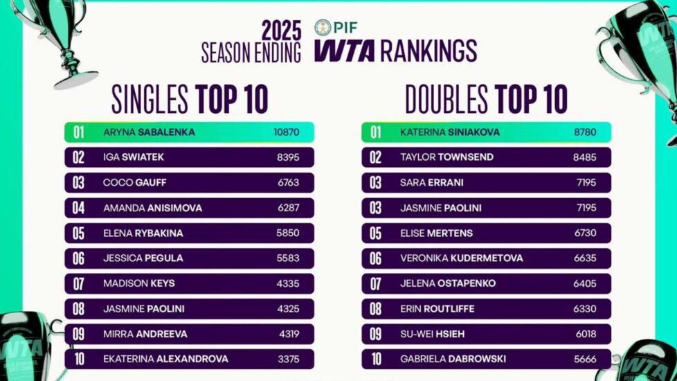 Sabalenka qëndron në majë për vitin e dytë radhazi. Humbjet e shumta në Finale të mëdha, përfshirë dy “Grand Slam” dhe “WTA Finals”, e penguan të shkëputej më shumë. Swiatek ka pasur një sezon me ulje-ngritje.