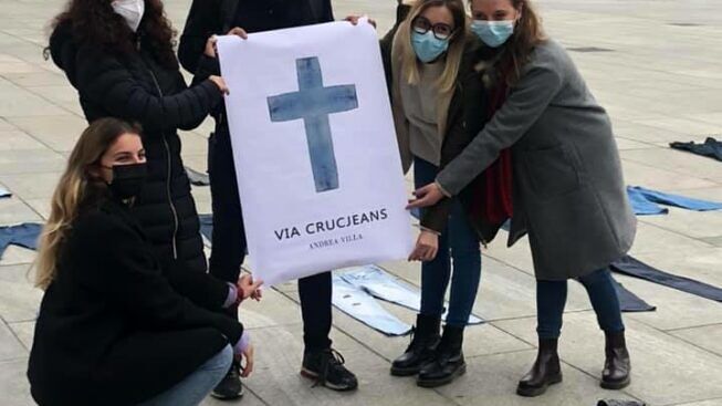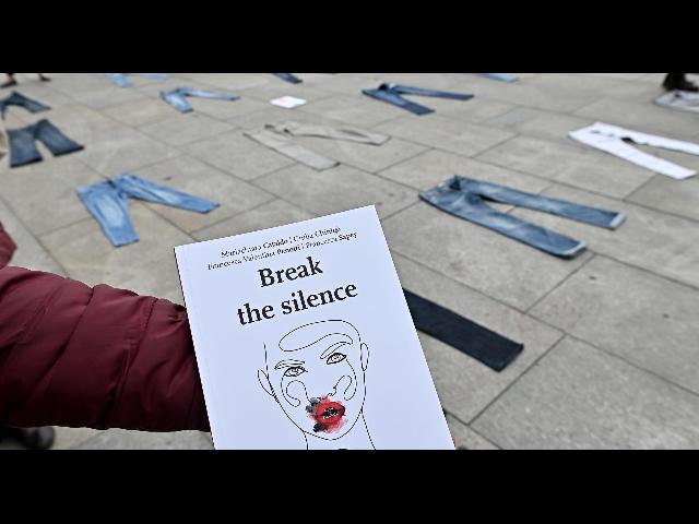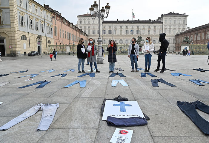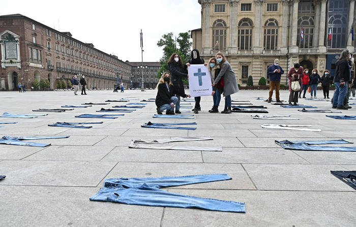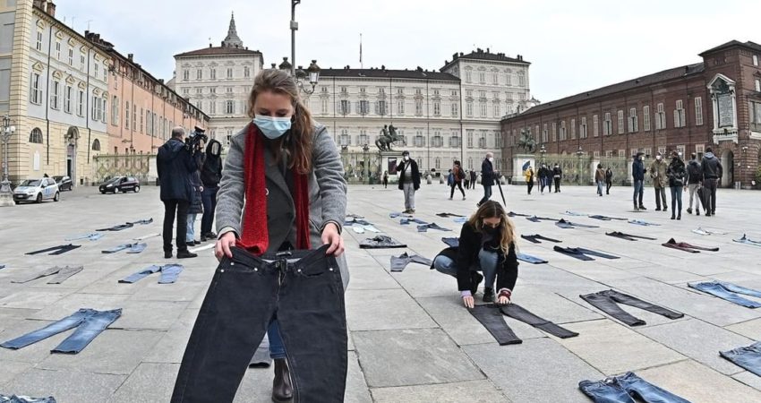 Në sheshin “Castello”, Torino, për t’i thënë “stop” dhunës ndaj gruas, shumë qytetarë kanë vendosur xhinse në tokë, në formë proteste. \La Stampa\
