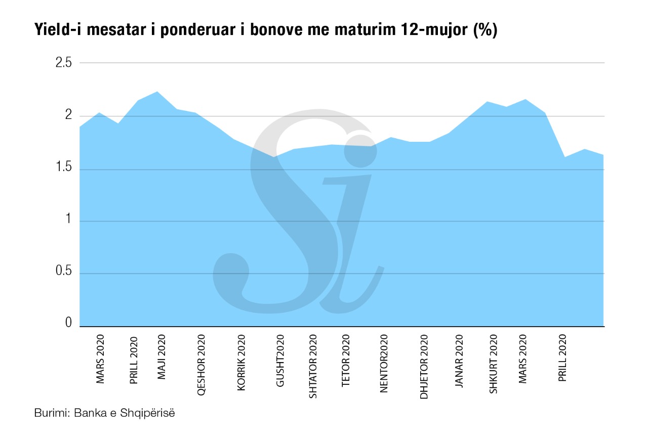 Sipas Bankës së Shqipërisë, yield-i mesatar i ponderuar rezultoi në nivelin 1.64%, shumë afër nivelit minimal të këtij viti, nga 1.63%, që ishte regjistruar në muajin prill.