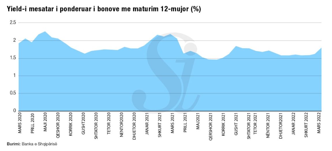 Yield-i mesatar i ponderuar i Bonove me maturim 12 mujor, sipas të dhënave nga Banka e Shqipërisë, arriti në 1.79%, nga 1.62% që kishte qenë në ankandin e mëparshëm.