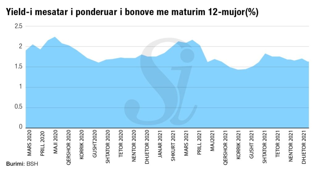 Bonot 12 mujore u emetuan me një yield mesatar të ponderuar 1.63%, nga 1.71% që kishte qenë në ankandin e mëparshëm, sipas të dhënave të Bankës së Shqipërisë.