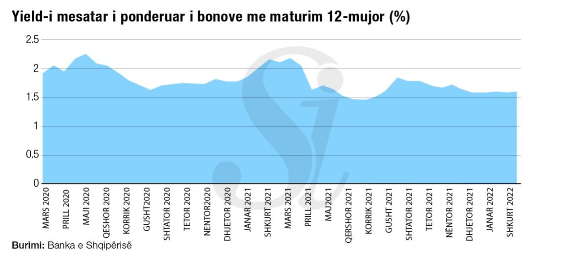 Në ankandin e kësaj jave, bonot me maturim 12 mujor u emetuan me një yield mesatar të ponderuar prej 1.58%, me një rritje të papërfillshme nga niveli prej 1.57% i ankandit të mëparshëm.