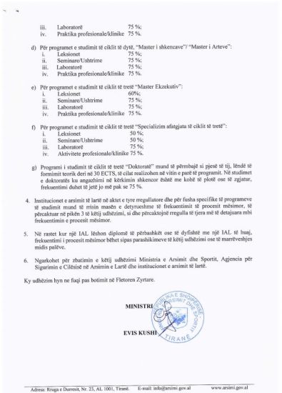 Në përfundim të vitit akademik, Ministria e Arsimit ka firmosur një udhëzim, për “Frekuentimin e procesit mësimor, sipas llojit të veprimtarisë mësimore në auditor dhe ciklit të studimit”, në të cilin përcaktohet sasia e orëve që duhet të frekuentojë në seminare e leksione çdo student, në varësi të llojit të ciklit të studimit që ndjek.