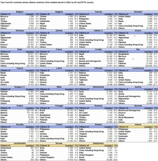 BE-ja lëshoi më shumë lejeqëndrimi për ukrainasit, 295 mijë, ndjekur nga indianët 192 mijë dhe marokenët 188 mijë. Por në total, thotë Eurostat, lejeqëndrimet për të huajt kanë rënë me 8.3% nga viti 2023, në 3.5 milionë.