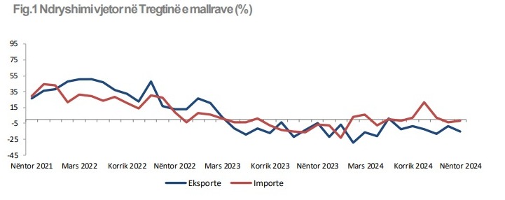 Defiçiti tregtar i këtij muaji është 43 mld lekë, duke u rritur me 10.9%, krahasuar me nëntor 2023 dhe duke u ulur me -6.5%, në krahasim me tetor 2024.