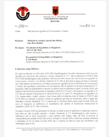 “Në këto kushte, aktualisht, në Universitetin e Tiranës, nuk është miratuar Komisioni Institucional Zgjedhor (KIZ), sipas kërkesave të nenit 6 të Rregullores së Zgjedhjeve të UT, si e vetmja strukturë që ka përgjegjësi për administrimin e procesit zgjedhor në UT.