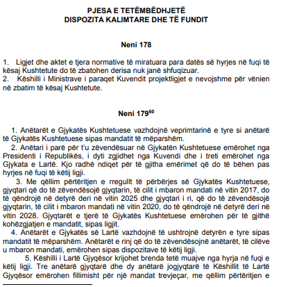 Sipas Nenit 179 parashikohet se anëtari i parë i Gjykatës përzgjidhet nga Presidenti i Republikës, i dyti nga Kuvendi dhe i treti emërohet nga Gjykata e Lartë. Pra radha është e saktësuar. Por në kushtet kur Gjykata e Lartë ndodhet jashtë funksionimit, vetëm Kuvendi dhe Presidenca mund të vendosin dhe maksimumi mund të fillojnë punën 6 anëtarë.