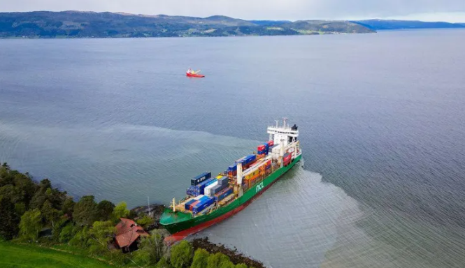Një burrë në Norvegji u zgjua dhe zbuloi se një anije e madhe kontejnerësh kishte ngecur në breg dhe ishte përplasur në kopshtin e tij të përparmë.