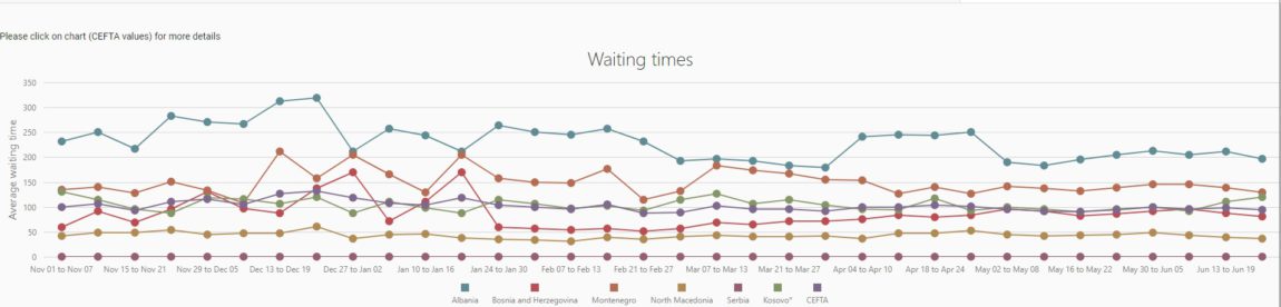 Sipas një renditje nga CEFTA, gjatë qershorit 2021, një kamion harxhon mesatarisht 3 orë e 20 minuta për procedurat e pritjes dhe zhdoganimit në pikat doganore hyrëse në Shqipëri. Koha e pritjes në Shqipëri është më e larta në rajonin CEFTA dhe me një diferencë të madhe nga vendi i dytë më kohën më të lartë të pritjes Mali i Zi ku një kamioni i duhet të presë 2 orë e 9 minuta.