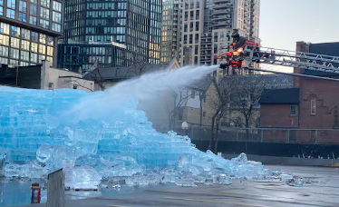 Ekipet e zjarrfikësve kanë filluar të shkrijnë blloqet e akullit, duke e përmendur instalacionin si “aktivitet të rrezikshëm dhe të pasigurt”.