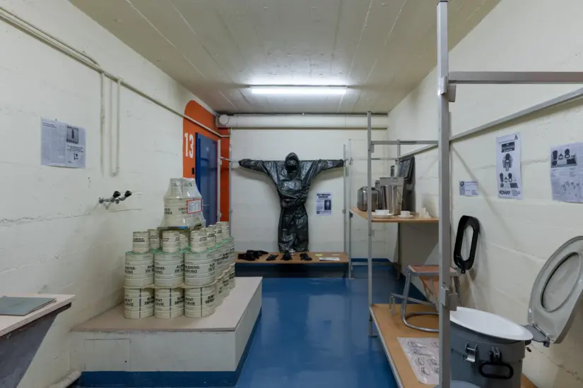 Mure dhe dysheme betoni të armuar, dyer masive, rezerva uji, gjeneratorë elektrikë, filtra të shumtë në kanalet e ajrit dhe një qendër komande.