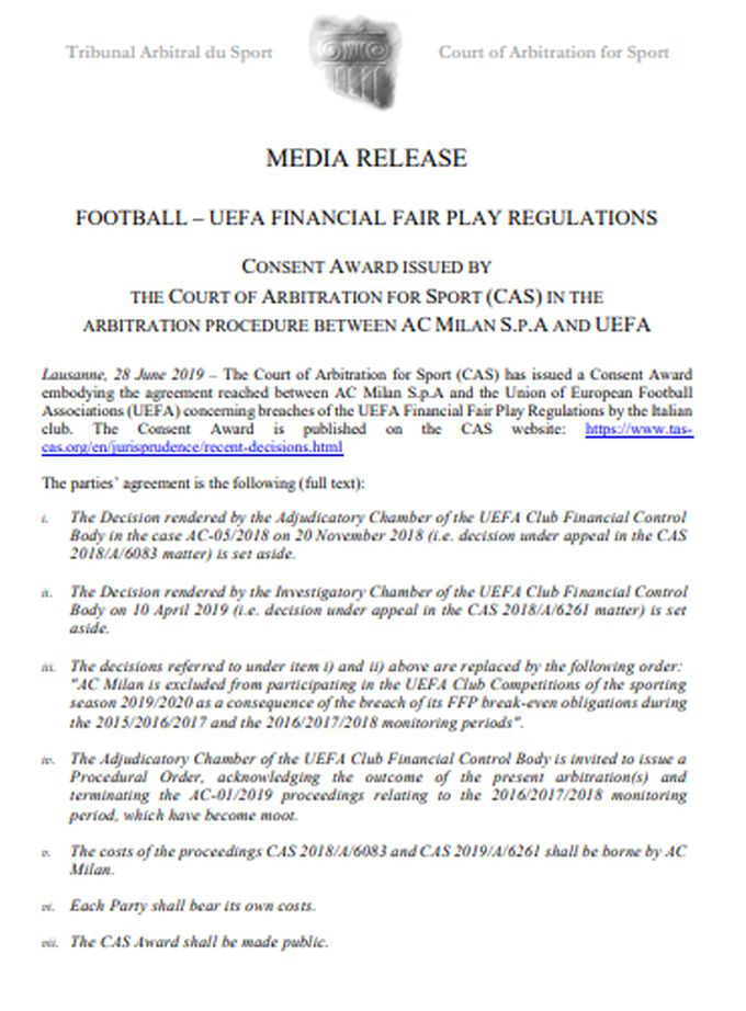 Milan nuk do të luajë në Europa League sezonin e ardhshëm. Në faqen zyrtare të CAS-it, doli publikimi i shumëpritur, në të cilin kuqezinjtë u përjashtuan nga sezoni i ardhshëm i Ligës së Europës edhe pse u rendit në vendin e pestë. Klubi kuqezi u përjashtua nga Liga e Europës për shkak të mungesës së përputhjes së bilanceve financiare dhe mos mbajtjen e një buxheti të balancuar mes shpenzimeve dhe të ardhurave që e kishte si detyrim nga UEFA për periudhën trevjeçare 2015-2016-2017. Ky përjashtim është zëvendësuar me sanksione të reja për Milanin që tani do e ketë akoma dhe më të vështirë që të rikthehet kompetitiv në dhe do ketë ndëshkime akoma edhe më të ashpra për mosrespektimin e rregullave të Fair Play financiar në të ardhmen.